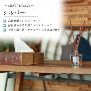 シルバー:光沢感のあるラベルデザインと存在感のあるラタンスティックが、洗練された印象を与えます