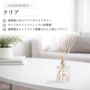 クリア:クリアなボトルラベルとサンドホワイトのスティックが調和し、穏やかで清らかな空気感を生み出します